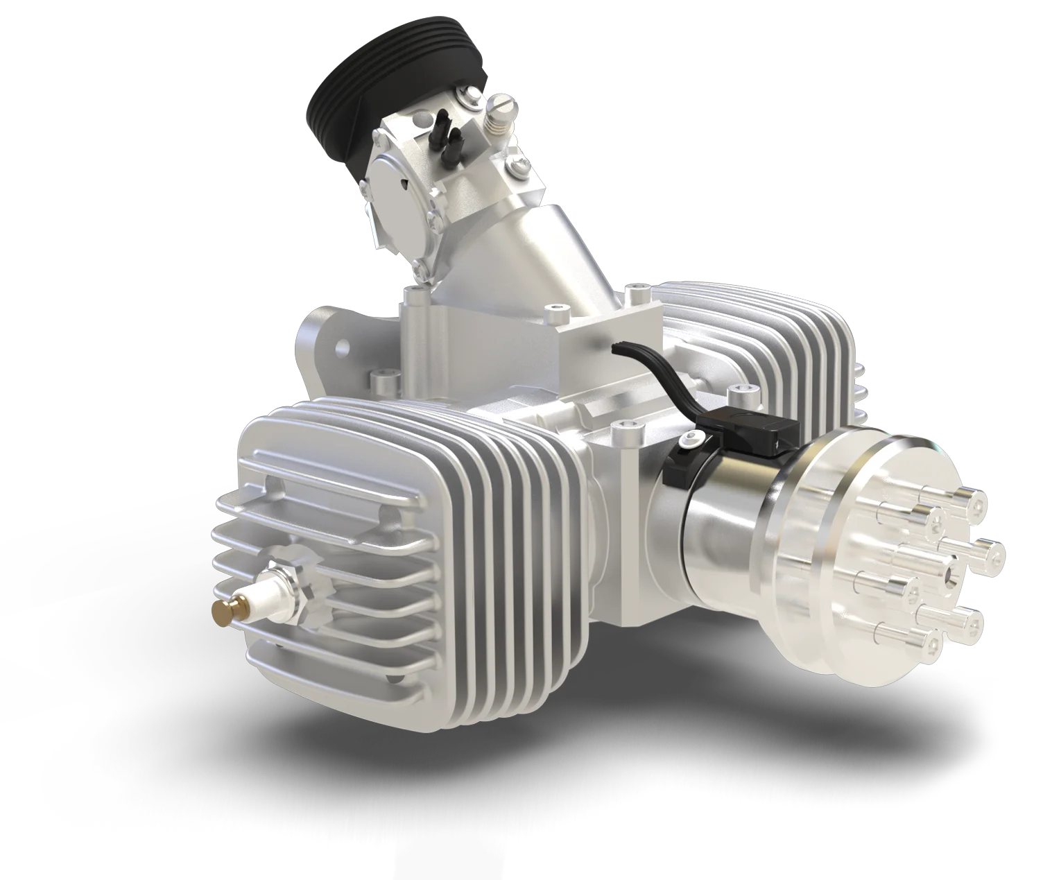 The SP-56 TS ROS is the newest, forged from using the proven SP-28 parts. The engine is equipped in the standard configuration with 1 sparkplug per cylinder due to the compact size. The dual cylinder Boxer engine style offers a low vibration power dense 2-stroke for the below ‘77 lbs or up to 35 kg’. The engine is used by customers in small helicopter config UAS as well as fixed wing platforms.